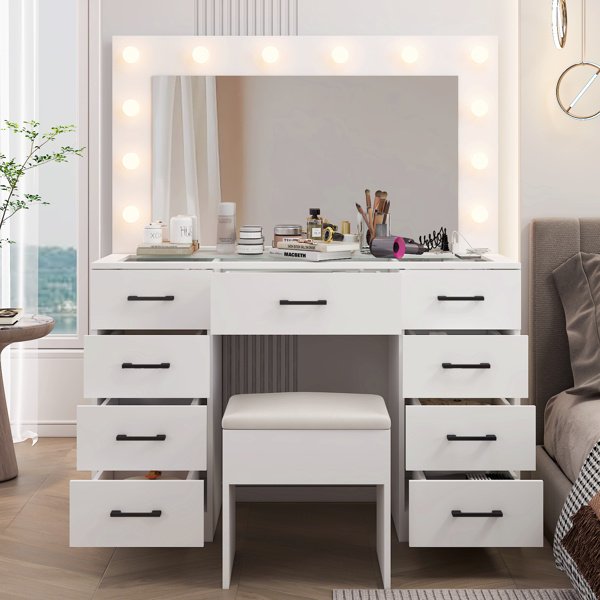 Enhance your beauty routine with this elegant Vanity Desk Set. Featuring a spacious lighted mirror with adjustable brightness and three color modes, this vanity provides the perfect lighting for any occasion. The sleek glass tabletop offers a chic, modern touch, allowing you to see all your essentials stored neatly below. With nine roomy drawers and a built-in charging station, you'll have everything you need right at your fingertips. Complete with a comfortable cushioned stool, this vanity is a luxurious addition to any bedroom or dressing area, making it the ultimate gift for beauty lovers.