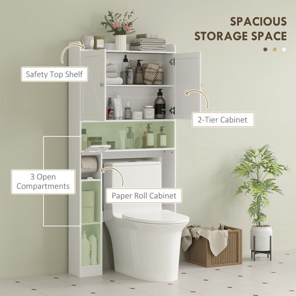 • - A safety top shelf, three open compartments, and a paper roll cabinet for convenience