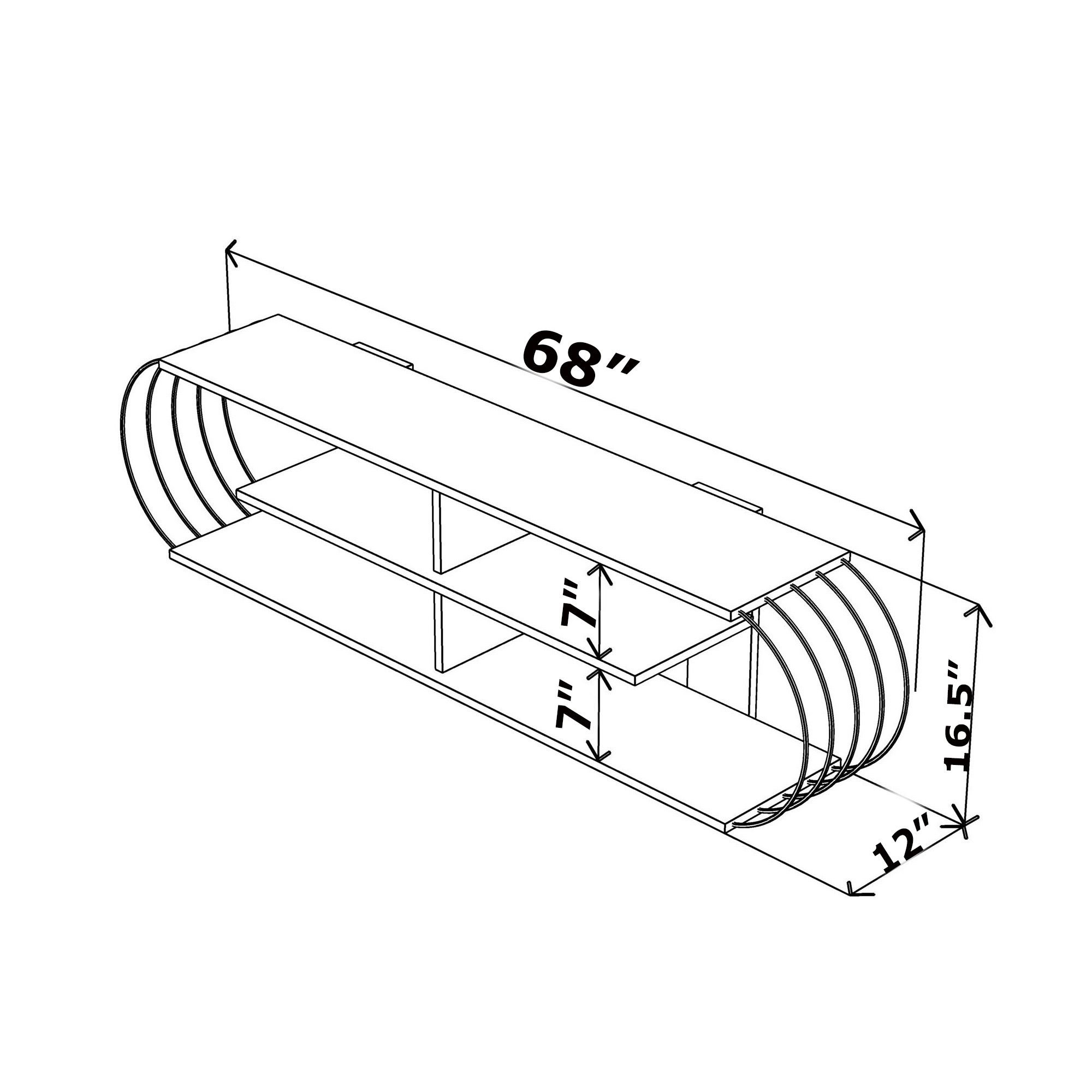 The mid century modern design of this wooden TV Stand will change the mood in your living rooms. High quality melamine coated chipboard and colorful curved metal edges combine to bring elegance to your living rooms. 4 shelves under the unit provides huge space your media entertainment and books. Cable management is also available to easily connect your devices to your television. With the color alternatives and elegant design it is suitable for every room. All of our products are being manufactured with ultimate care and ensured to be quality checked for best customer experience and satisfaction. Dimensions: 68" W 16.5" H 12" D